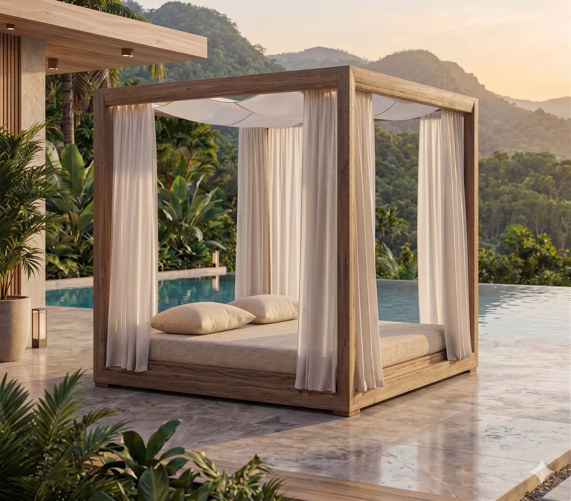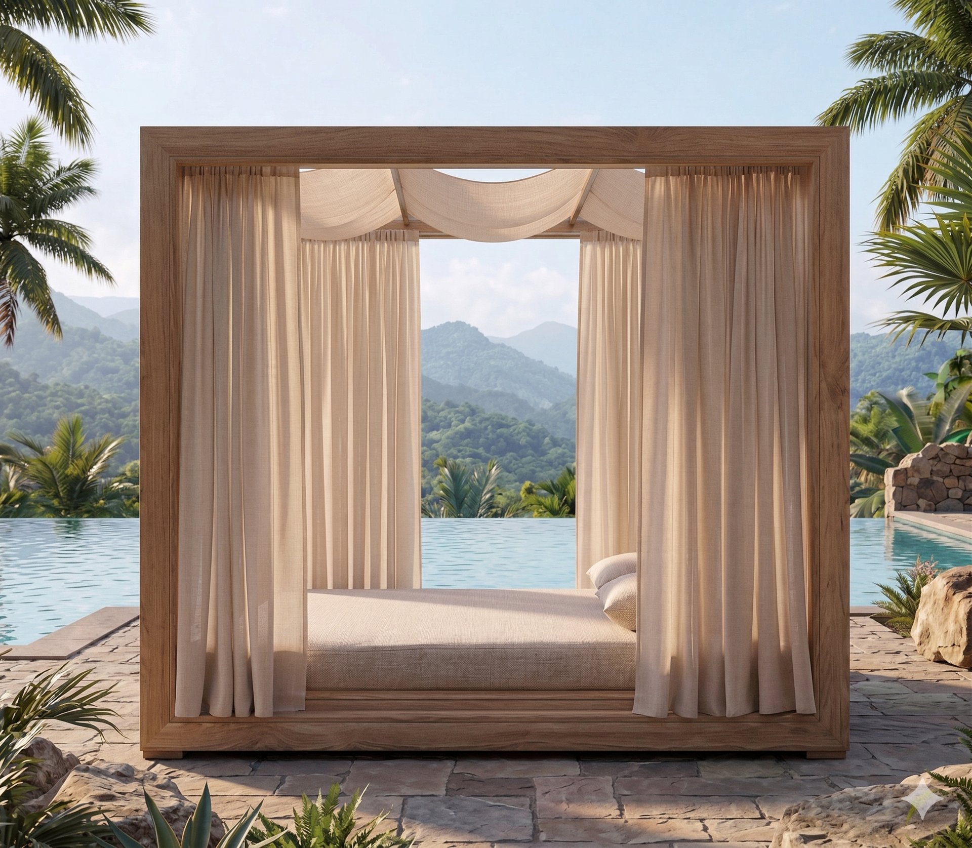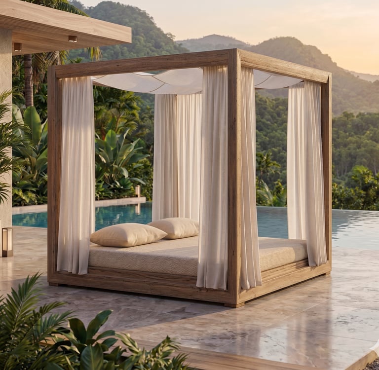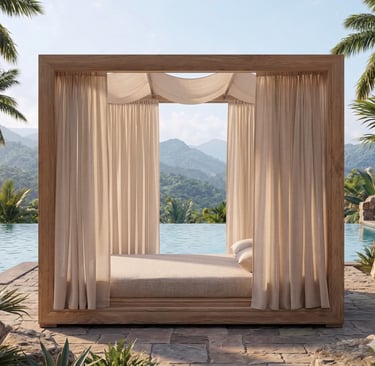 An immersive pavilion designed for absolute stillness. The open, double-fronted structure in Grade A Teak offers an unobstructed, 360-degree panorama. Defined by the absence of a fixed backrest, the Sanctuary provides unconditional comfort. Modular, high-performance cushions allow you to sculpt your ideal angle of repose, perfectly adapted to face the sun, the ocean, or the complete privacy of the shaded interior.