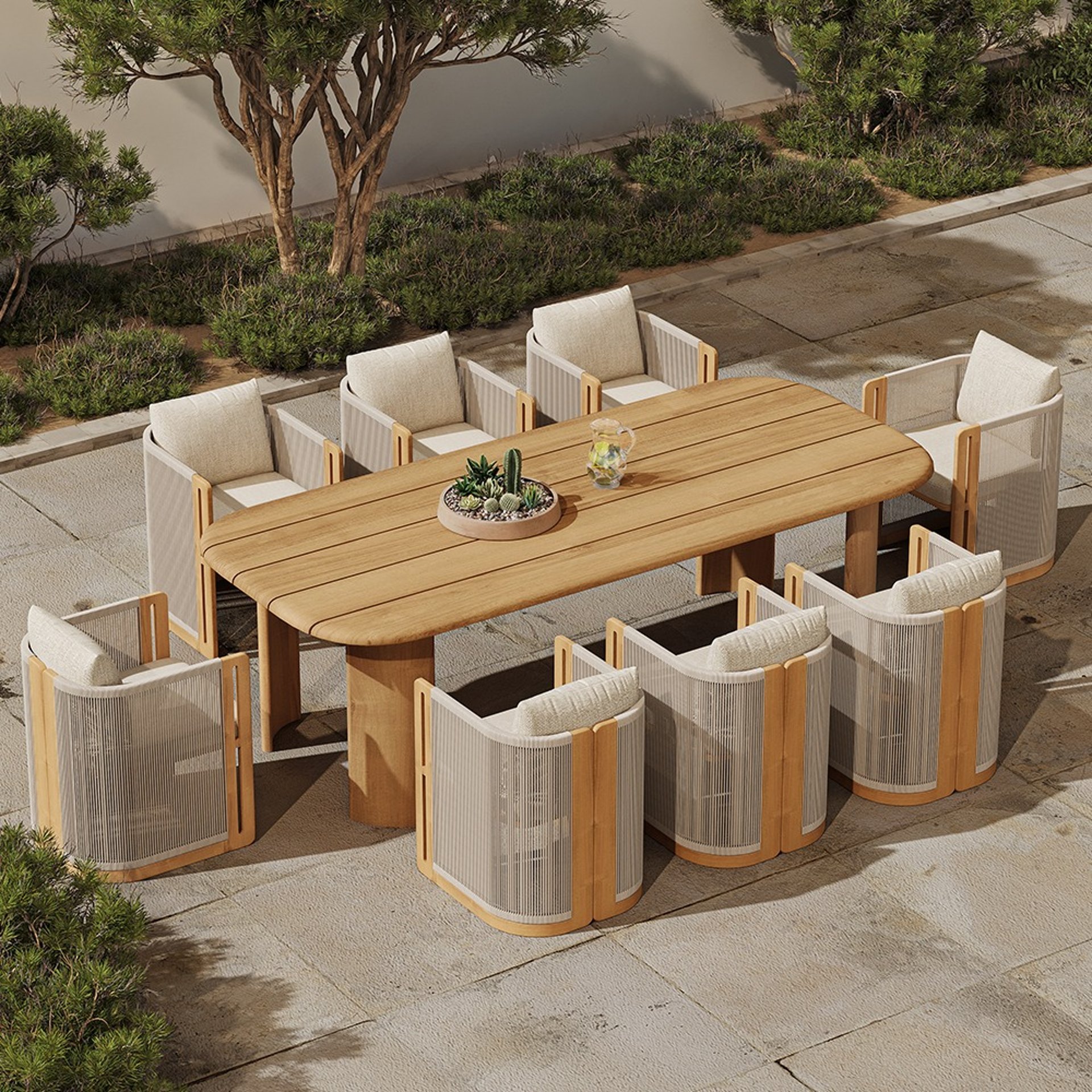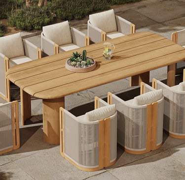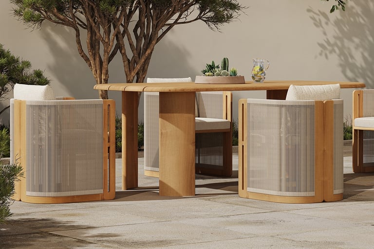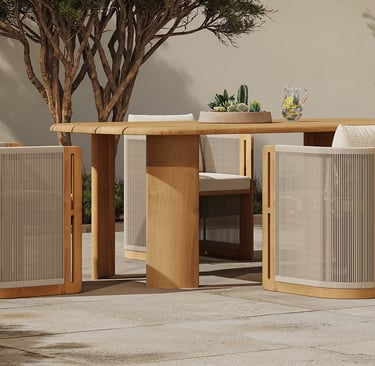 Crafted from premium teak with elegant sweeping curves, its sculptural silhouette creates a warm, natural ambiance. Designed to endure, this set combines timeless Mediterranean charm with a modern spirit, developing a beautiful patina that only gets better with time.